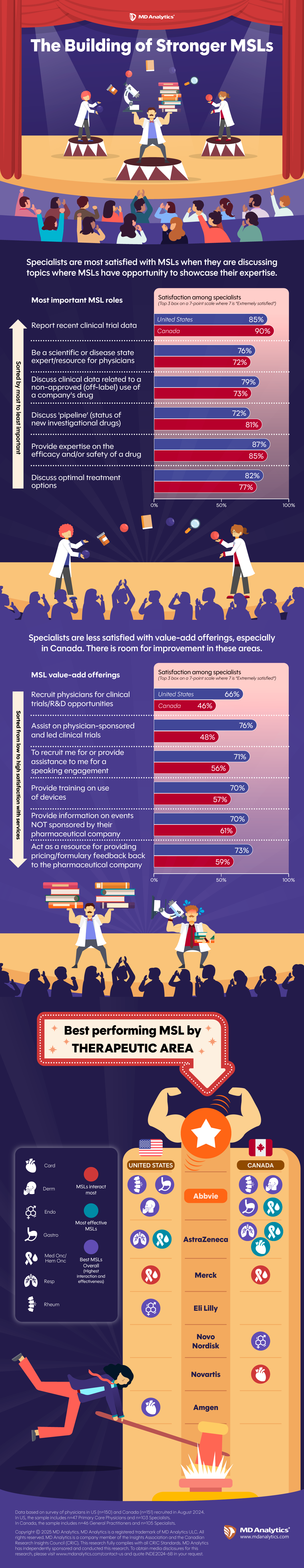 However, the findings reveal gaps in value-added services, particularly in Canada, where satisfaction rates are lower. MSLs have a significant opportunity to differentiate themselves by supporting physician-sponsored clinical trials and speaker programs – two services where satisfaction levels are notably lower.