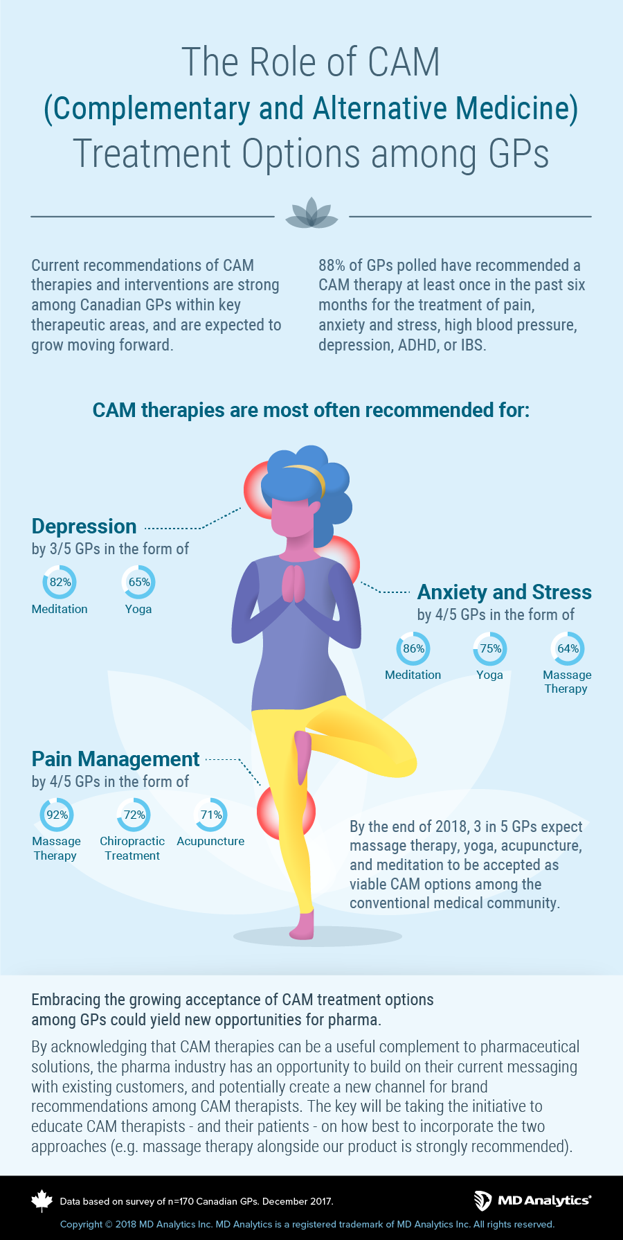 By the end of 2018, 3 in 5 GPs expect massage therapy, yoga, acupuncture, and meditation to be accepted as viable CAM options among the conventional medical community. By acknowledging that CAM therapies can be a useful complement to pharmaceutical solutions, the pharma industry has an opportunity to build on their current messaging with existing customers, and potentially create a new channel for brand recommendations among CAM therapists. They key will be taking the initiative to educate CAM therapists and their patients on how to best incorporate the two approaches (e.g. massage therapy alongside our product is strongly recommended). See our infographic for a more detailed look at the findings from this survey.