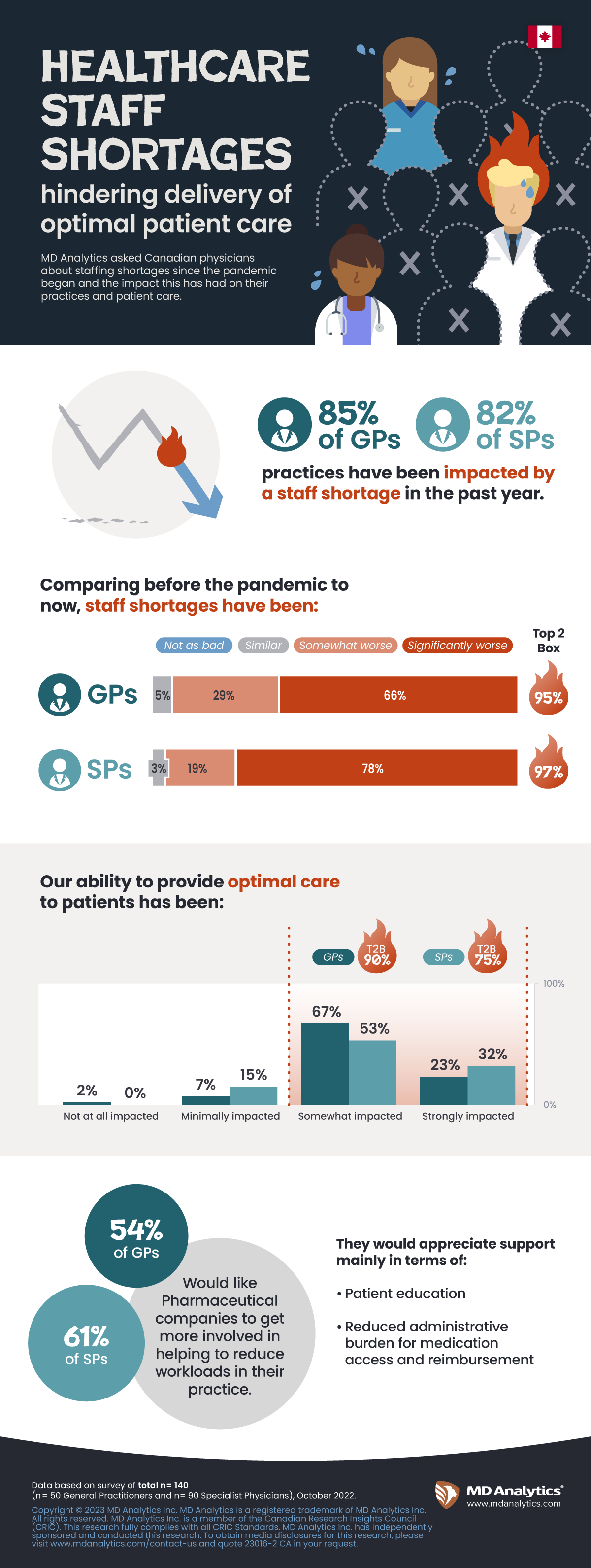 Since the start of the pandemic there has been a substantial rise in shortages of healthcare workers across Canada. To what extent does this shortage affect physicians and their practice? How severe has the staffing shortage been in the past year? What type of support do physicians seek in order to reduce the workloads in their practice? To answer these questions MD Analytics surveyed 50 family medicine physicians and 90 specialists on the topic of healthcare staffing shortages across Canada, post pandemic.