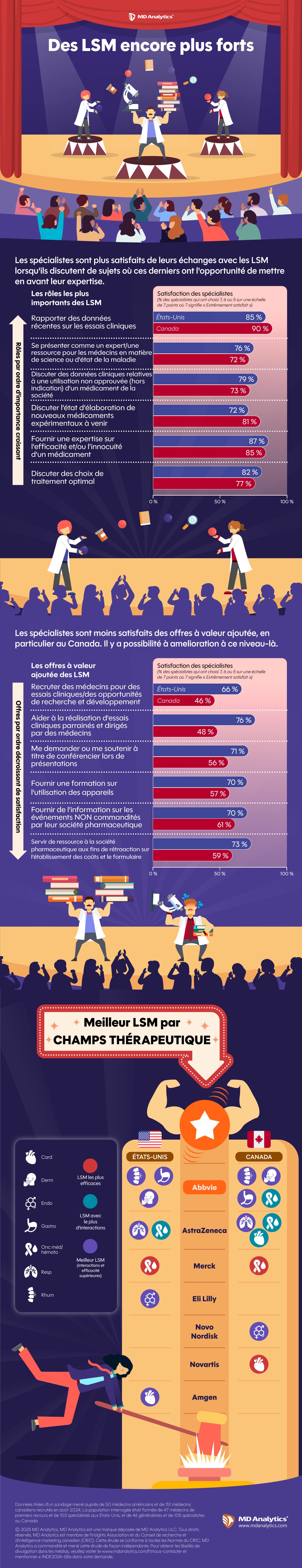 Cependant, les résultats révèlent des lacunes en matière de services à valeur ajoutée, en particulier au Canada, où les taux de satisfaction sont plus faibles. Les LSM ont une occasion unique de se démarquer en soutenant les essais cliniques initiés par les médecins et les programmes de conférenciers – deux services où les niveaux de satisfaction sont particulièrement bas.
