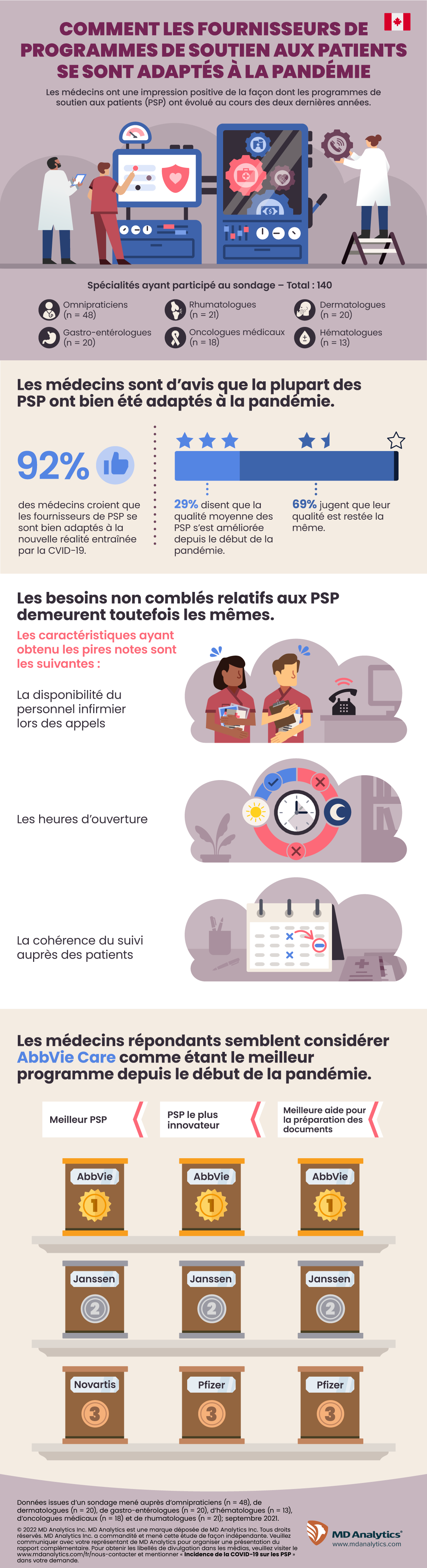 Bien qu’AbbVie et Janssen tendent à être mentionnés plus souvent que les autres en tant que meilleurs PSP depuis la pandémie, plus de la moitié des médecins ne peuvent identifier spécifiquement un PSP qui a été plus innovateur que les autres. La rapidité des suivis et la grandeur du soutien financier expliquent généralement pourquoi un PSP donné est préféré aux autres.