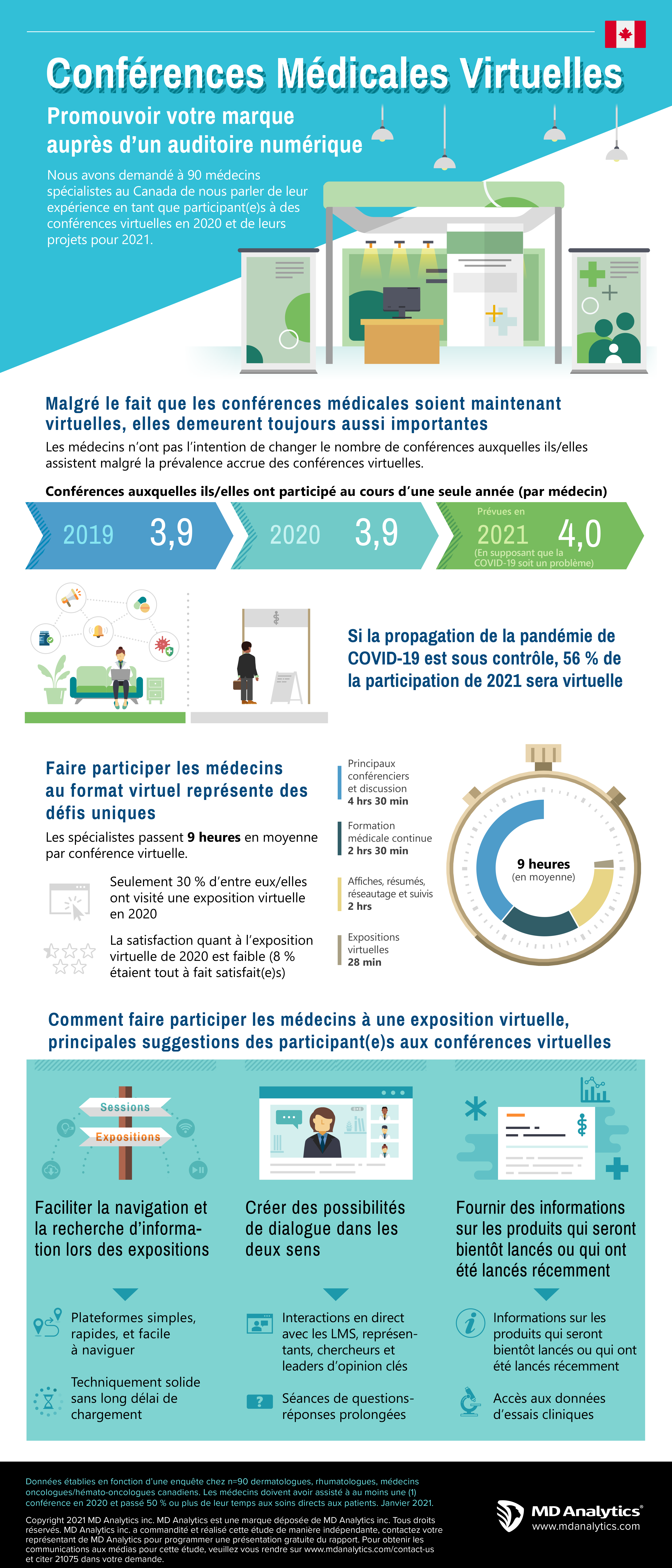 MD Analytics a cherché à répondre à certaines de ces questions en réalisant une enquête en ligne auprès de 90 spécialistes médicaux au Canada afin de mesurer leur réaction aux conférences médicales virtuelles de 2020 et de savoir si ces spécialistes comptaient participer aux principaux événements de 2021.